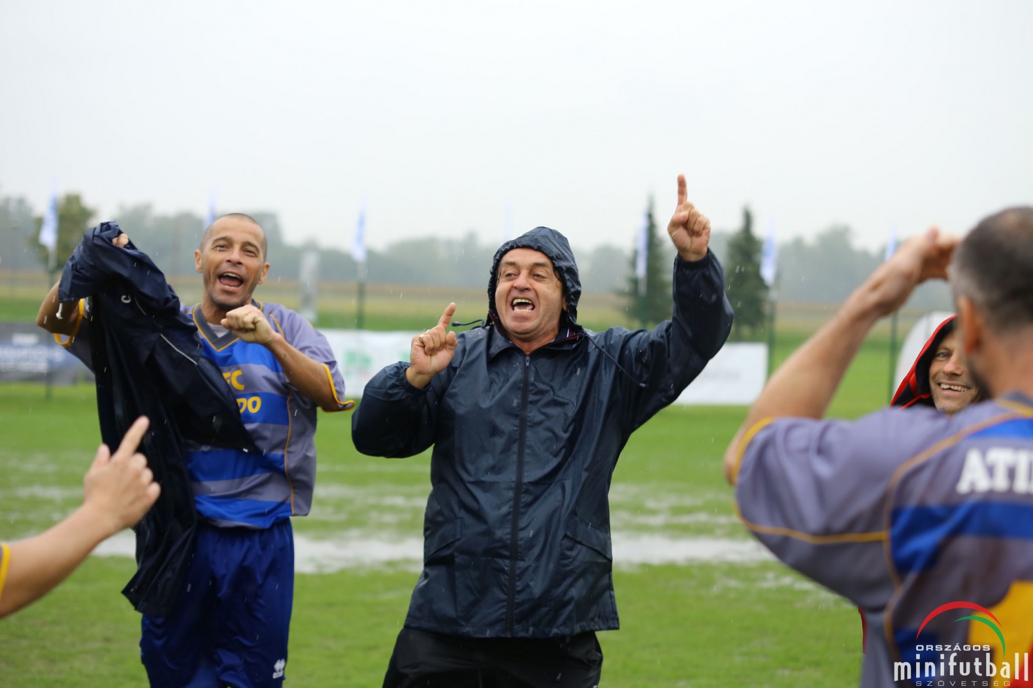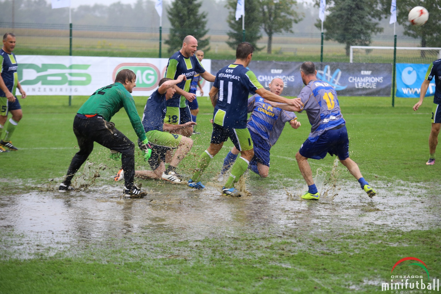 A seniorok rájátszása hétfőre maradt. Sajnos az időjárás nem kedvezett a csapatoknak, hiszen a reggel szemerkélni kezdő eső csak nem akart elállni. Így nem a foci, hanem a küzdelem dominált mindkét elődöntőben. A szlovén KMN Meteorplast büntetőből szerzett vezetést a csepeli 1. FC Corrado ellen, mely egészen a végjátékig kitartott. Ekkor lehozta kapusát Pintye László, ám egy előre vágott labda utáni újabb bekapott gól végleg megpecsételte sorsukat.