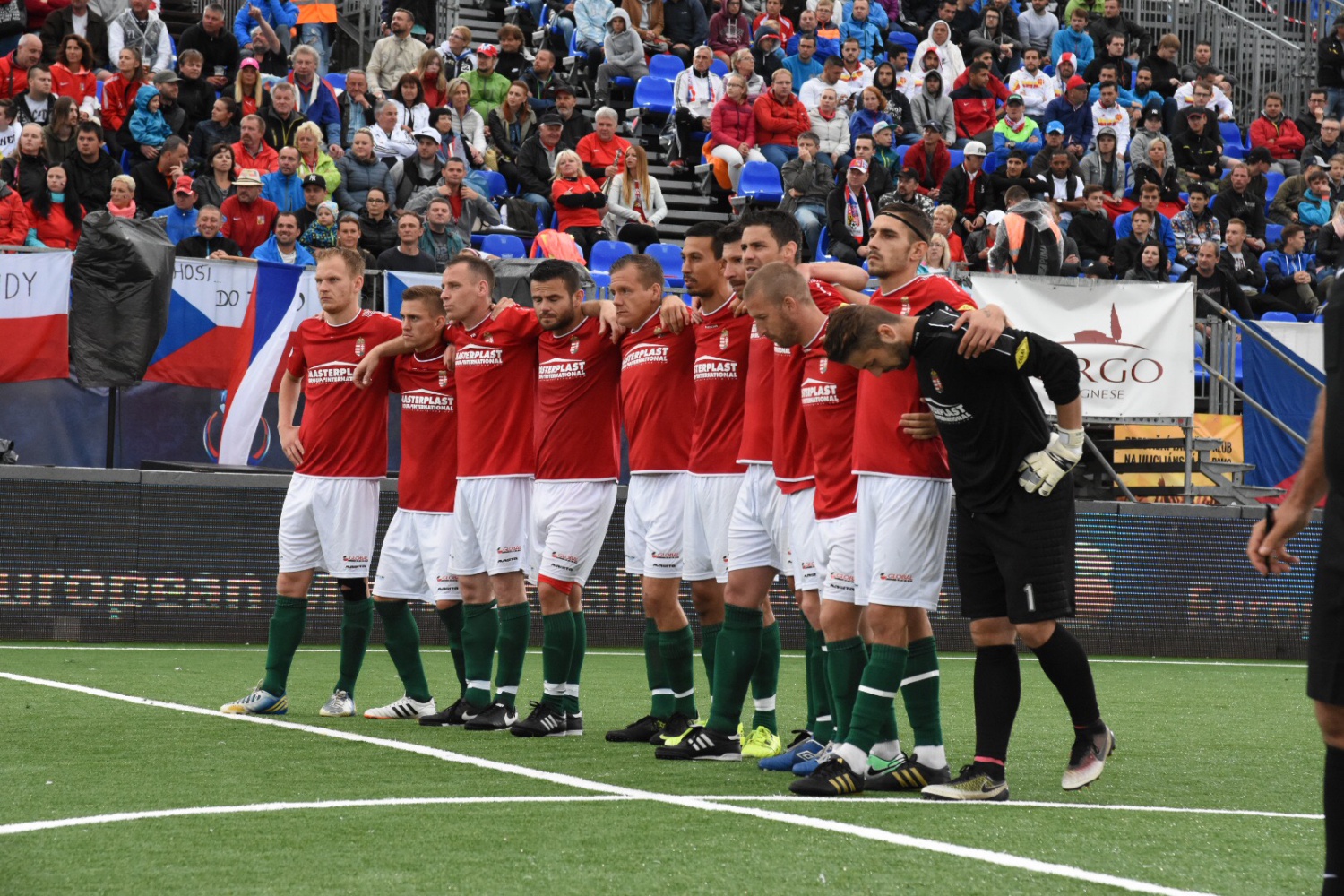 Érkeznek a csapatok a pályára, mindjárt jönnek a himnuszok.